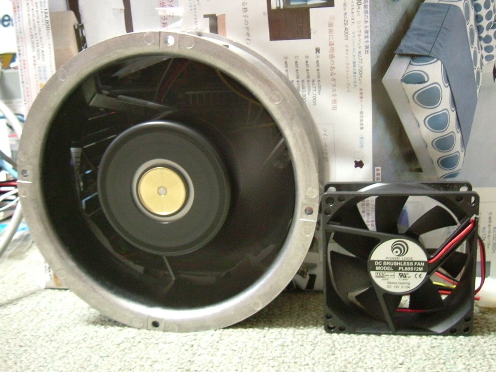 直径が 17cm もある産業用 DC ファンをデジットで発見。 12V・0.95A の大した品。使い道など無いがとりあえず購入 (笑)。 冗談半分で実験機 nagisa の横っ腹につけてみたら五月蝿い五月蝿い…。 まぁ大学の UNIX サーバとどっこいどっこい程度の騒音なんで耐えられなくも無いけど。 nagisa の電源を切ってる状態でも筐体背面の 8cm ファンが風圧で勝手に回りだすのが印象的 (PC 内蔵の電源容量不足のためファンは別電源を用意した)。