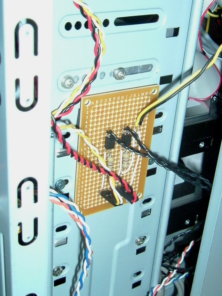 ケース全面のパネルを良く見ると、2 個ついている LED が 2 色点灯方式のものである事が分かった。 2 色点灯 LED は、この手の商品では一般的なカソードコモン (陰極共有) 方式。 一方、マザーボードの LED 駆動信号はどうも独立した 2 個の LED のドライブのみを想定しているようで、 電源・HDD 動作の各信号の陰極の電圧が不揃いであった。こりゃどうやっても点灯しないわ。