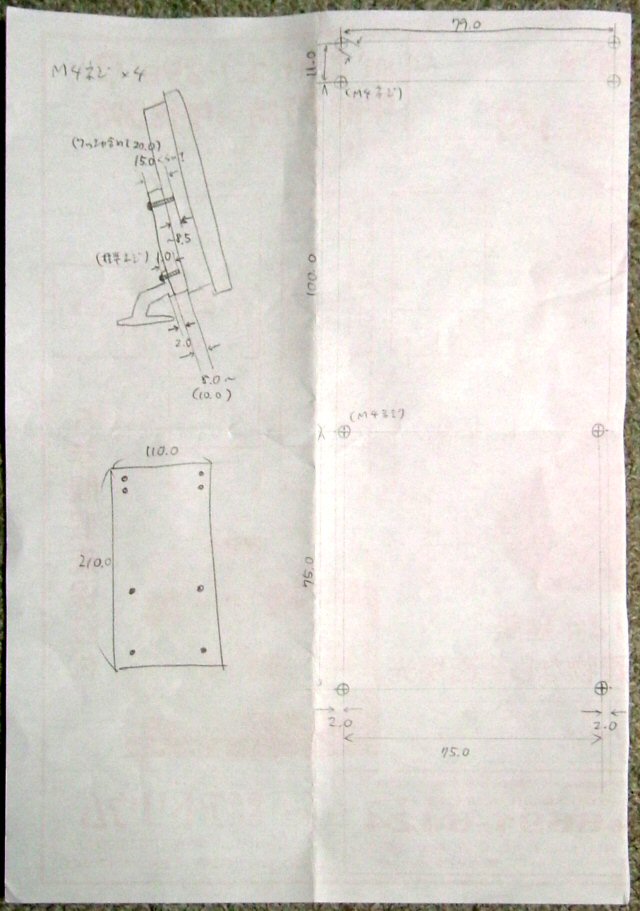 設計図をいい加減に書きます。…どれ位いい加減かって、何せチラシの裏ですからね。 工学部の人間がこんなのでいいのか。 ネジ穴がずれると固定できなかったり、機構部を破損したり、 また完成時にディスプレイが水平でなくなったりする (笑) 原因になるので採寸だけは慎重に。