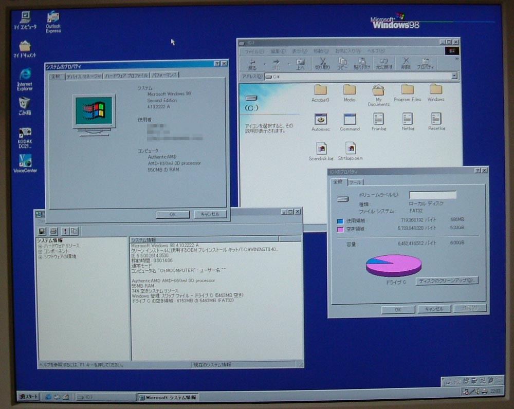 初期状態で入っている Win98SE を起動してみたところ。