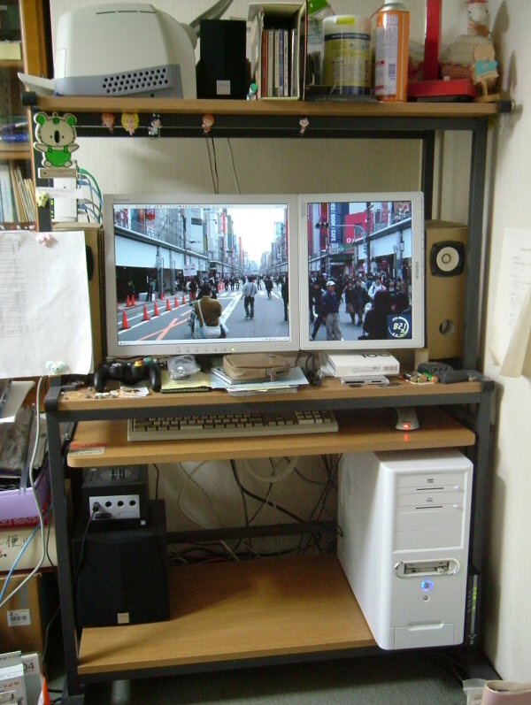 何故か GeForce FX5700 との相性でノイズが生じるのが玉に瑕。 「RDT158V-N」 は XGA (1,024 x 768) の 15 インチ LCD。アナログ RGB にて接続。 スタンドを改造して -90 度回転させて使用中。 画面上方、やや右寄り (-90 度回転した後では左方やや上寄り) の位置に一箇所緑色の常時点灯画素がある。 2 つのモニタをあわせたデスクトップのサイズは 2048 x 1024 に達する。 |