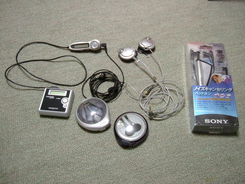 Creative 製のポータブル HDD プレーヤ、MuVo2 と SONY 製のイヤホン 4 種。別にこだわりがあるわけでは無いがイヤホンは SONY 製ばっかりになってしまった。 このうち写真右端にあるノイズキャンセリングヘッドホン MDR-NC11 は故障続きでまともに使えた試しがなく、結局返品する事に。